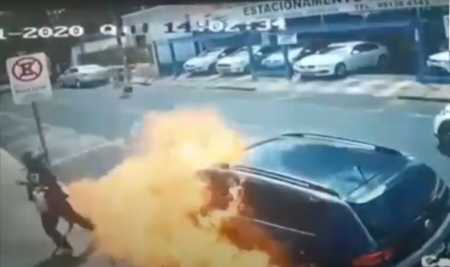 O vídeo, ao qual o G1 teve acesso, mostra que o homem caminhou com um galão em uma das mãos, atravessou a rua e despejou um líquido inflamável no veículo.