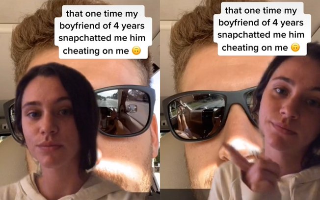 Sydney contou essa história no TikTok e ó vídeo já tem quase 2 milhões de visualizações. “Aquela vez que meu namorado de quatro anos me mandou um snap enquanto me traia”, escreveu a jovem. No post, ela mostra que o ex estava dirigindo e no reflexo de uma das lentes dava para ver as pernas de uma mulher sentada no banco de carona.
