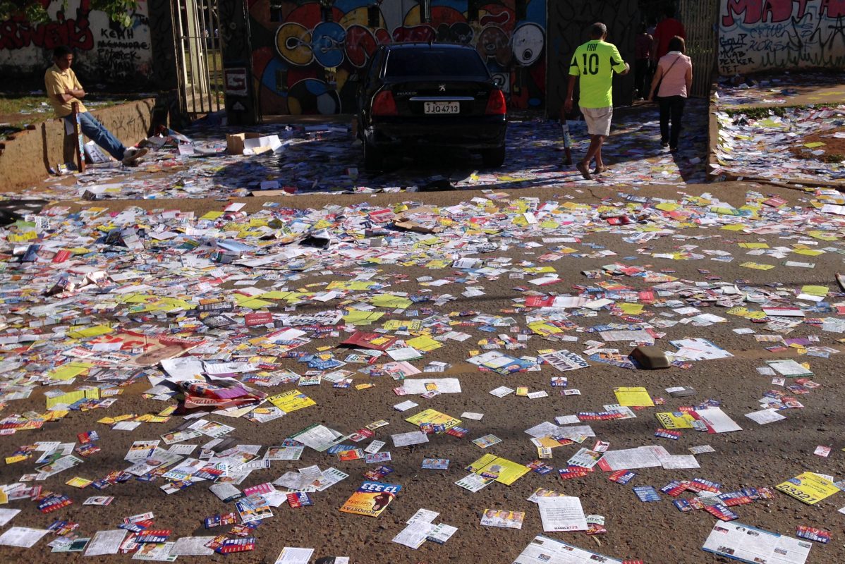No entanto, a distribuição de qualquer tipo de propaganda eleitoral, no dia da eleição, é ilegal configurando crime de propaganda eleitoral irregular (art. 39, §5º, II da Lei 9.504/97) e possível crime ambiental (art. 54 da Lei 9.605/98), cujas penas são detenção, de seis meses a um ano e reclusão, de um a quatro anos, respectivamente, além de multa.