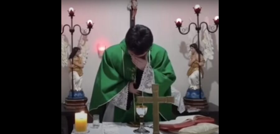 O padre Fabrício Rodrigues, da Paróquia São Félix Valois, em Marabá, sudeste do Pará, não conseguiu segurar o riso enquanto celebrava uma missa on-line.