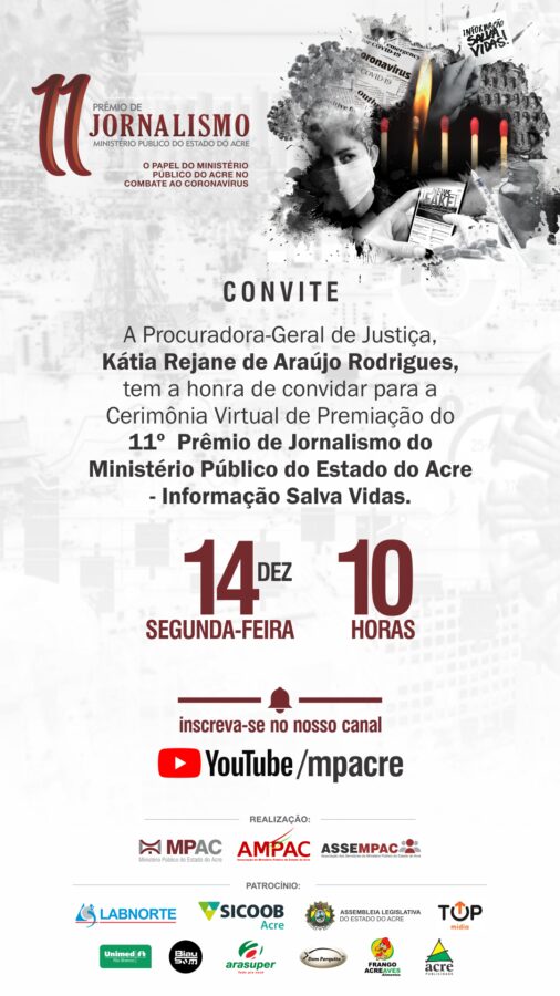 Já em mãos desta colunista o convite para o 11º Prêmio de Jornalismo do Ministério Público do Estado do Acre que acontece esse ano em Cerimonia Virtual no dia 14 de dezembro as 10h.