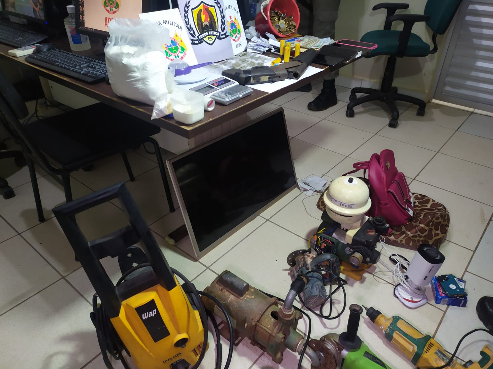 No local os PMs encontraram 3 bombas d’água, várias trouxinhas de skunk, várias trouxinhas de cocaína, 1 escopeta calibre 20 com 5 munições intactas, material para embalagem, 2 Balanças de precisão, vários cartões de crédito, cartas direcionadas ao presídio Francisco de Oliveira Conde, 2 furadeiras, 2 lixadeira e 1 televisor e muito dinheiro em espécie.
