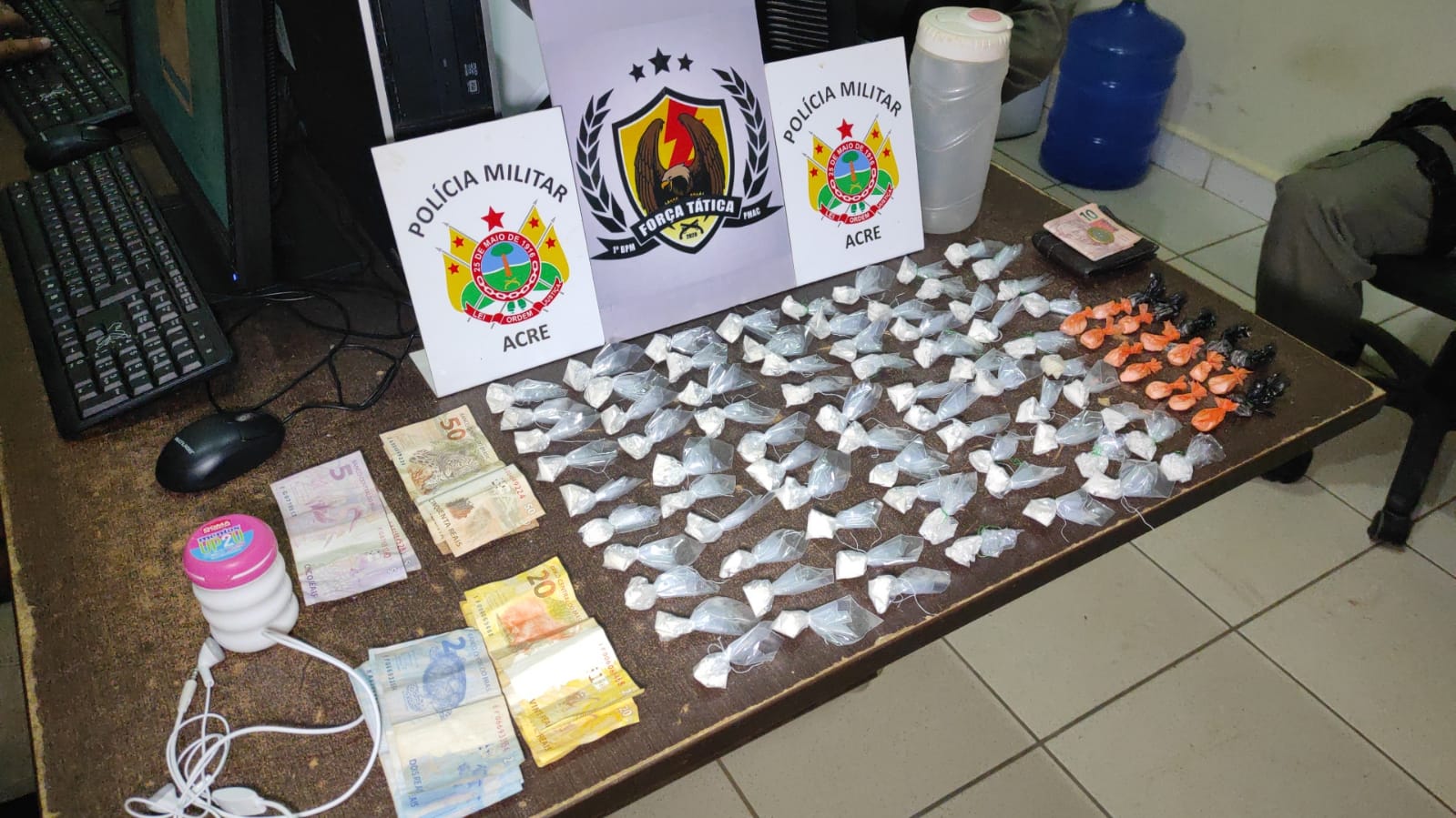 Em uma rápida vistoria na área que os acusados estavam, os militares acabaram encontrando 74 trouxinhas de merla, 19 trouxinhas de cocaína e uma quantia de R$ 184 oriundo do tráfico de drogas.