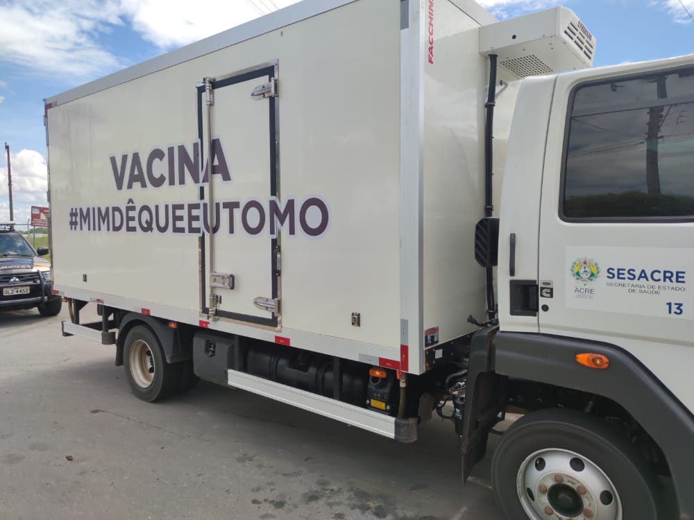 O lote com os imunizantes saiu do aeroporto escoltado pelas forças de segurança do Acre.