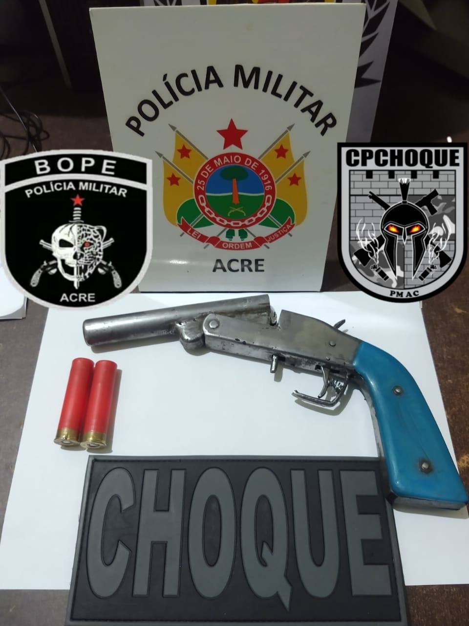 Policiais militares da Companhia de Policiamento de Choque (Cpchoque), da Polícia Militar, capturaram um foragido da justiça e apreenderam uma arma de fogo na Trav. Baguari, no bairro Taquari, na madrugada de segunda-feira, 1° de fevereiro.