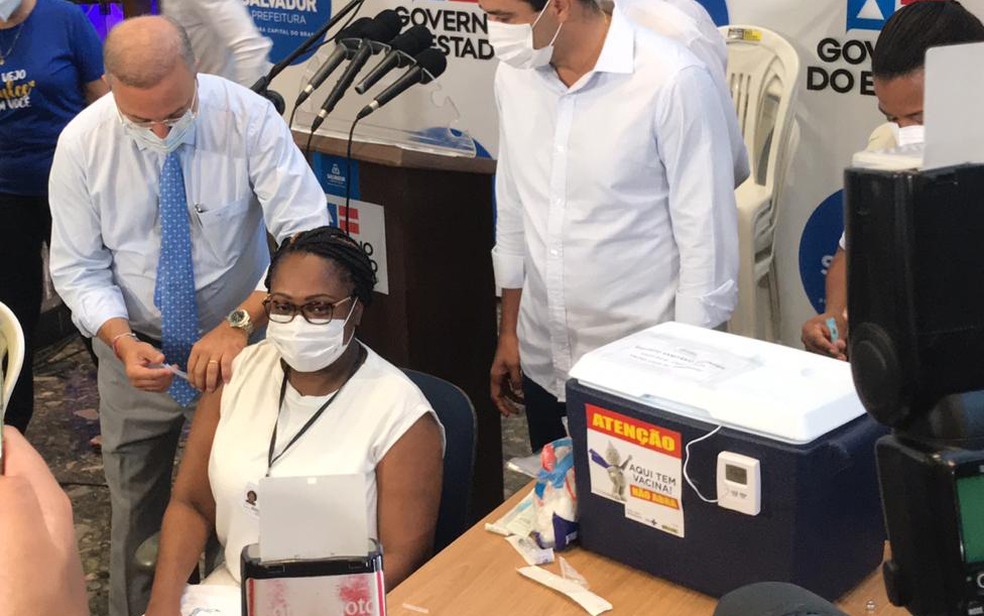A enfermeira Maria Angélica de Carvalho Sobrinho, de 53 anos, primeira pessoa vacinada contra a Covid-19 na Bahia, contraiu a doença antes de tomar a segunda dose do imunizante.