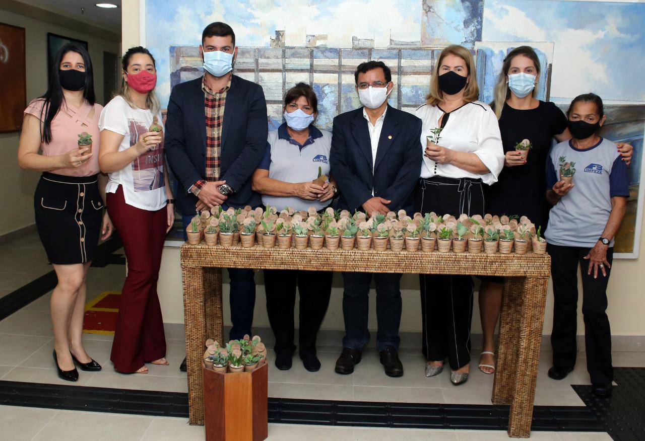 Antes da sessão solene, Nicolau Júnior e o primeiro secretário da Mesa Diretora, deputado Luiz Gonzaga, em nome de todos os parlamentares homenagearam as mulheres servidoras da casa e deputadas em nome de Luzanira Lima do Nascimento, técnica legislativa, e Maria de Lurdes Oliveira da Silva, que trabalha no setor de manutenção e limpeza, que receberam uma lembrança das mãos dos parlamentares.