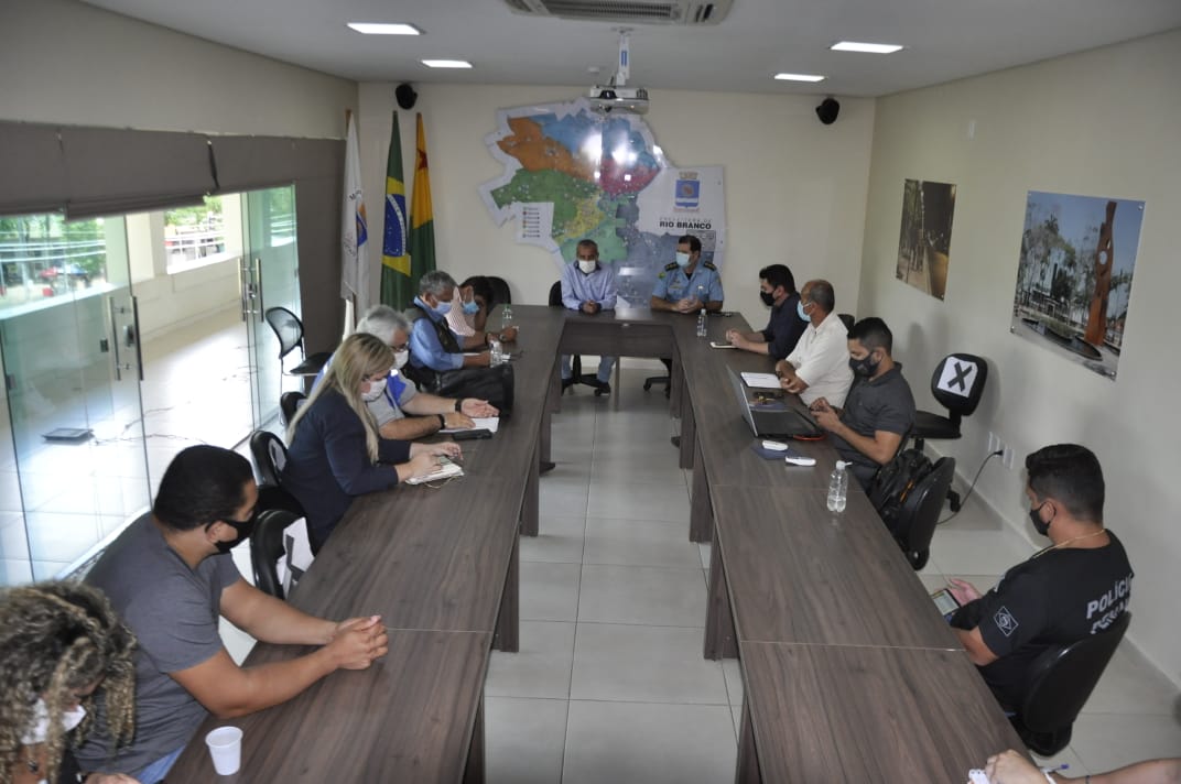 Uma reunião interagências foi realizada nesta terça-feira, 2, na sede da prefeitura de Rio Branco para definir estratégias de ação conjunta das forças de segurança na fiscalização e aplicação do Decreto estadual nº 8.147, assinado pelo governador Gladson Cameli que, dispõe sobre medidas restritivas, excepcionais decorrentes do agravamento da situação epidemiológica, motivada pelo novo coronavírus, e, a iminência de colapso do sistema de saúde.