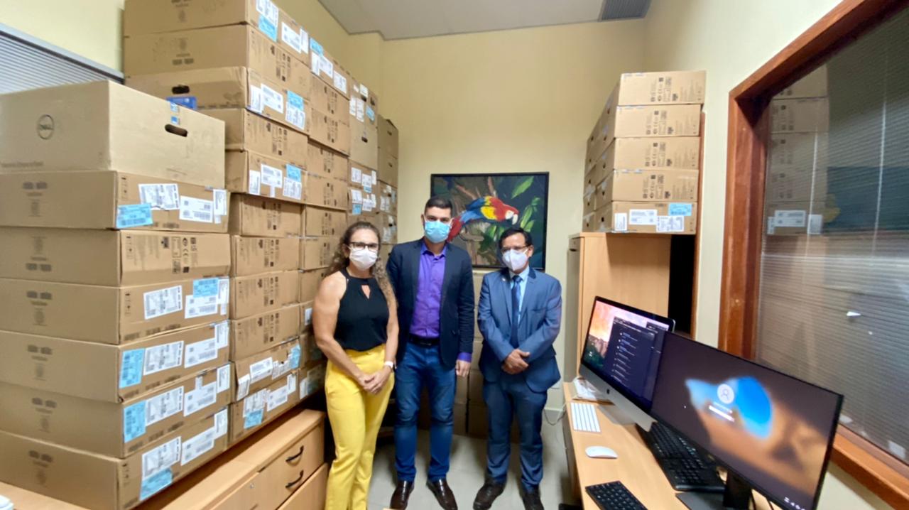 Além da presidência e do primeiro secretário, a chegada dos equipamentos foi acompanhada pela Secretária Adjunta Executiva da Aleac, Evelena Cardoso.