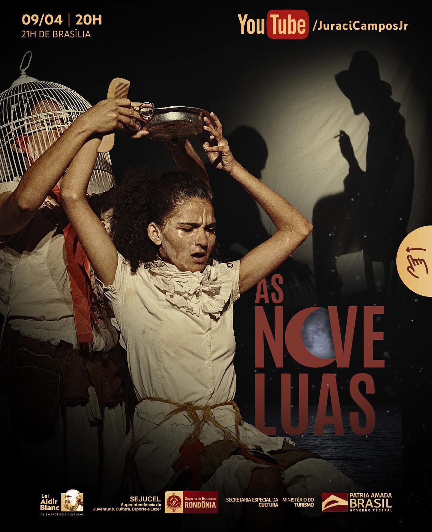 A programação especial do projeto Casa em Cena segue nesta sexta-feira (09), com a exibição do espetáculo As Nove Luas, da Cia de Artes Fiasco, de Porto Velho. Com transmissão no YouTube e Facebook a partir das 19h (horário local), a montagem traz uma reflexão sobre a lenda indígena do boto e os casos de abuso de meninas e mulheres na Amazônia.