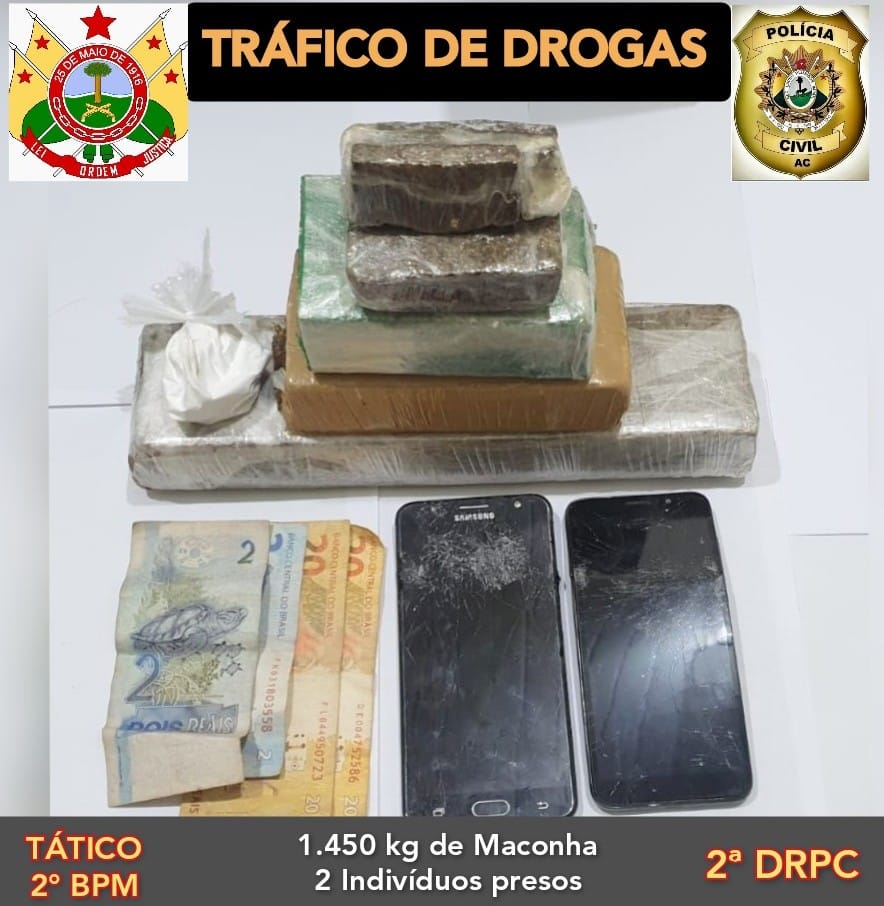 Após a abordagem, as equipes policiais realizaram, mediante autorização, uma busca nos locais em que os alvos supostamente utilizavam para a prática dos delitos, onde foi localizado aproximadamente 2 kg de maconha em tabletes, dinheiro e um caderno com registro de movimentação de drogas.