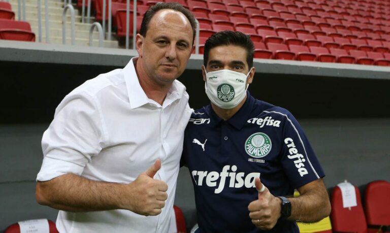 O técnico Abel Ferreira, da SE Palmeiras, é cumprimentado pelo técnico Rogerio Ceni do CR Flamengo, durante partida válida pela trigésima primeira rodada, do Campeonato Brasileiro, Série A, no Estádio Mané Garrincha. (Foto: Cesar Greco)