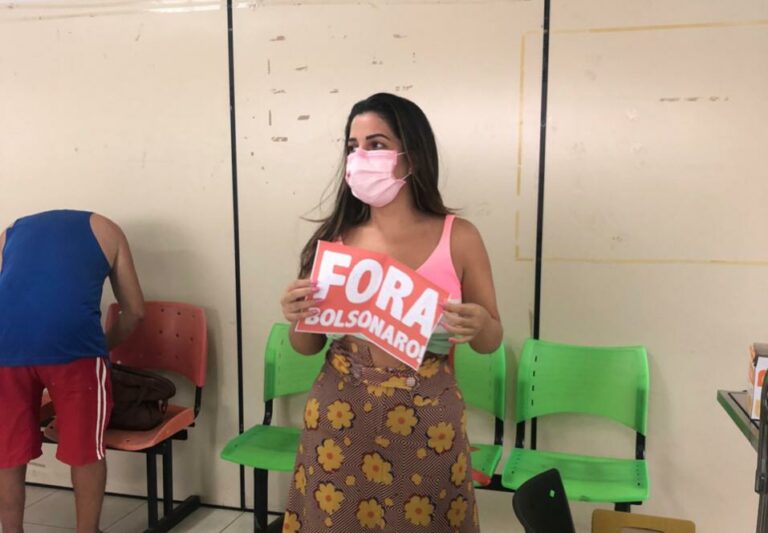 A mulher levou uma plaquinha escrita “Fora, Bolsonaro” e afirmou, em suas redes sociais, que o funcionário, identificado como José Rosimar, não permitiu a manifestação, chegando a ir pra cima dela e da amiga que fotografava o ato.