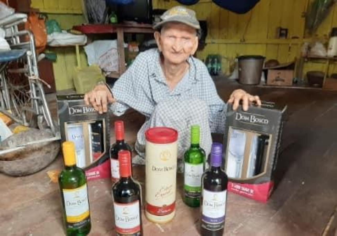 Ele ganhou uma autêntica coleção com os principais produtos, incluindo o Dom Bosco. Seu Zuzu agradeceu o mimo e exibiu a carta que veio acompanhando o presente com referência aos seus 111 de vida.