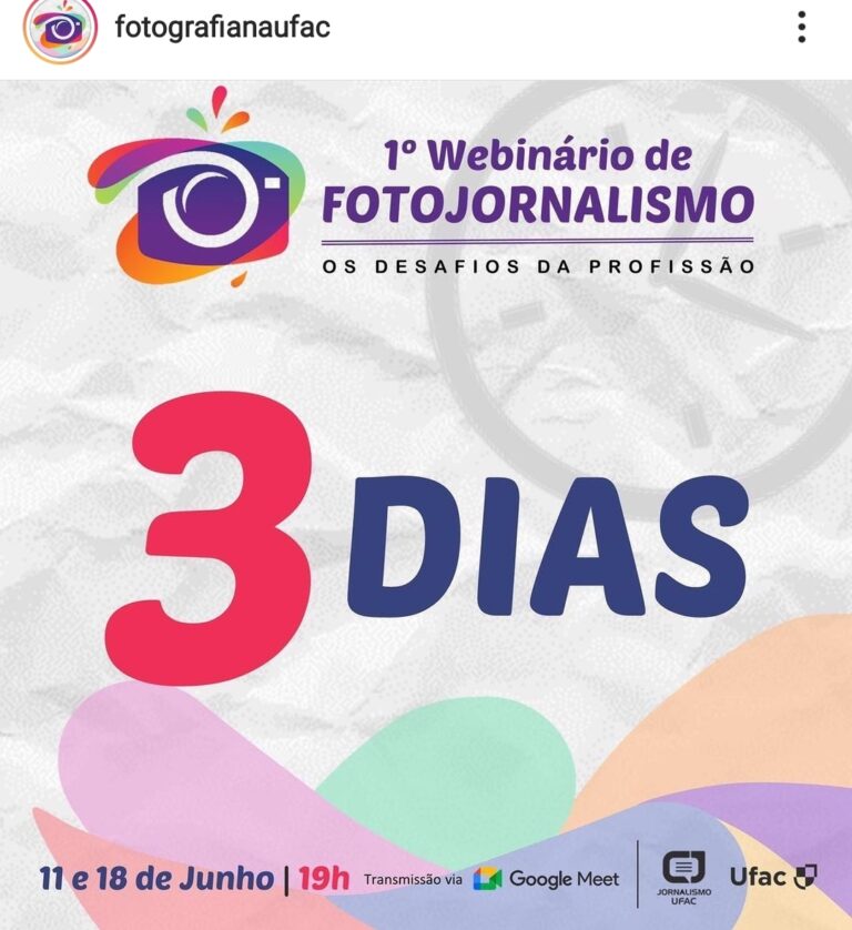 O Curso de Bacharelado em Jornalismo da Universidade Federal do Acre (Ufac) realiza, nos dias 11 e 18 de junho de 2021, o 1º Webinário de Fotojornalismo com o tema: “Os desafios da profissão”. O evento será transmitido pelo Google Meet a partir das 19 horas (horário Acre). Os interessados podem se inscrever através do link: https://bityli.com/ HZdST, até o dia 09 de junho.