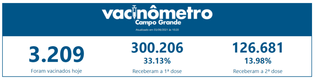 CAMPO GRANDE (MS) – A capital do Mato Grosso do Sul, Campo Grande atingiu na manhã desta quinta-feira (3) a marca de 33% de sua população vacinada contra a Covid-19 com pelo menos uma dose. Neste momento, as 17h30 (horário MS), o numero corresponde a 305.161 pessoas (33,68%). Com a dose de reforço, já somam 129.191 pessoas. Ao todo, o município aplicou 432.631 doses de vacinas.