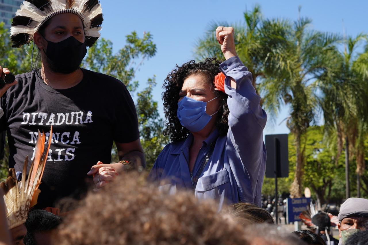 A parlamentar estava chegando na Câmara quando foi informada do tumulto, e seguiu para o manifesto em defesa da pauta indígena, ao lado da deputada federal Joênia Wapichana. Outros parlamentarem de oposição também participaram do ato.