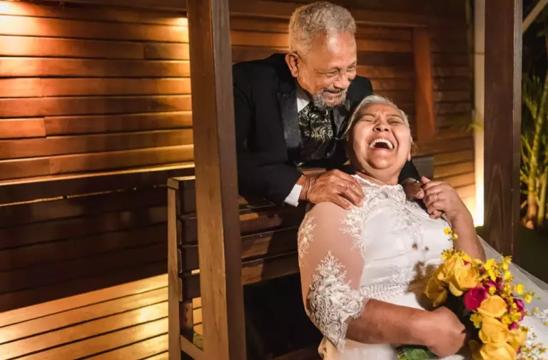 Após 50 anos de casados, Maria Aurelina Gonçalves de Oliveira, de 71 anos, finalmente realizou o sonho de se vestir de noiva para renovar os votos de felicidade com o Agenor Nunes de Oliveira, 79. Com direito a véu e grinalda, ela celebrou as bodas de ouro ao lado do amor da sua vida no dia 3 de junho desse ano, em Campo Grande. E o que emociona, são as fotografias cheias de sorrisos, como certeza de um sonho realizado.