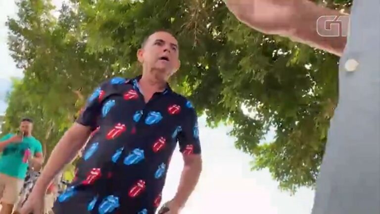 “O que vai filmar aí?” O repórter responde: “eu vim fazer o meu trabalho”. O ex-prefeito então continua: “Primeiro vou tomar teu telefone. Tu veio a mando de quem aqui?”