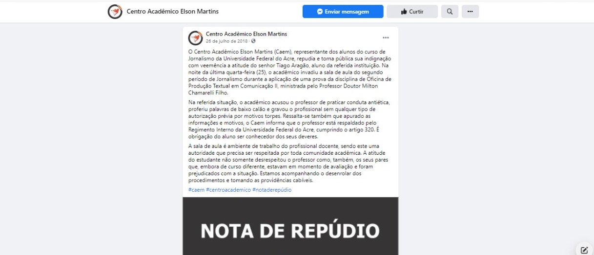 O Tribunal de Justiça do Acre (TJAC) condenou o Centro Acadêmico Elson Martins (CAEM), do curso de Jornalismo da Universidade Federal do Acre (Ufac), a pagar R$1 mil de indenização, a título de danos morais, por postar uma nota de repúdio a um estudante de medicina na página oficial do centro com informações falsas.