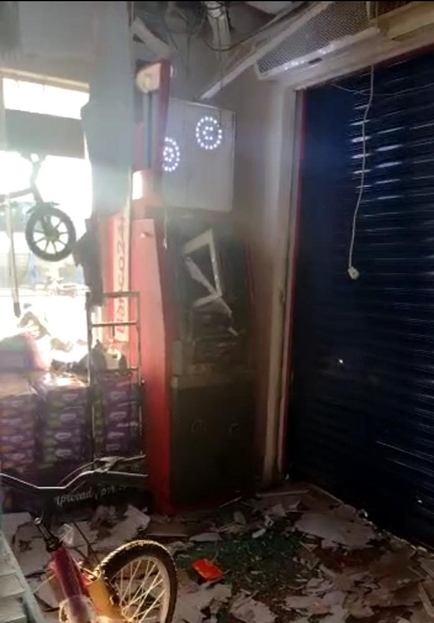 Ao entrar na farmácia, os meliantes foram direto para o caixa 24 horas, onde quebraram a parte da frente e colocaram dinamites. Após alguns minutos, o estouro destruiu parcialmente o local, mas os criminosos não conseguiram ter acesso ao cofre do caixa eletrônico.