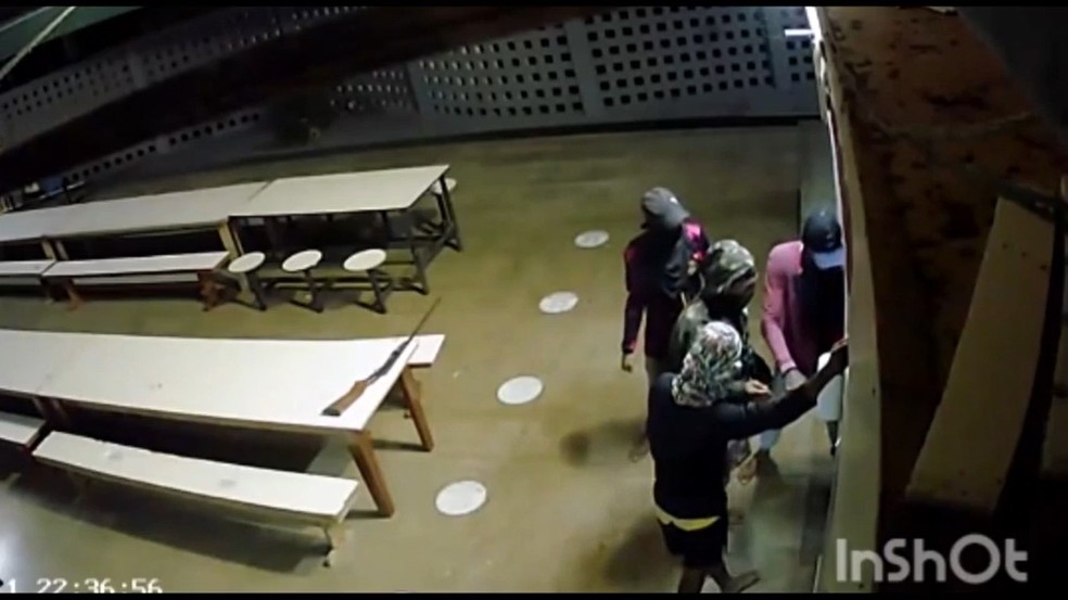Um vídeo feito por uma câmera de segurança flagrou a ação dos criminosos. As imagens mostram quando o bando consegue arrombar a porta e entrar no estabelecimento. Em seguida, os homens saem carregando materiais e até um botijão de gás.