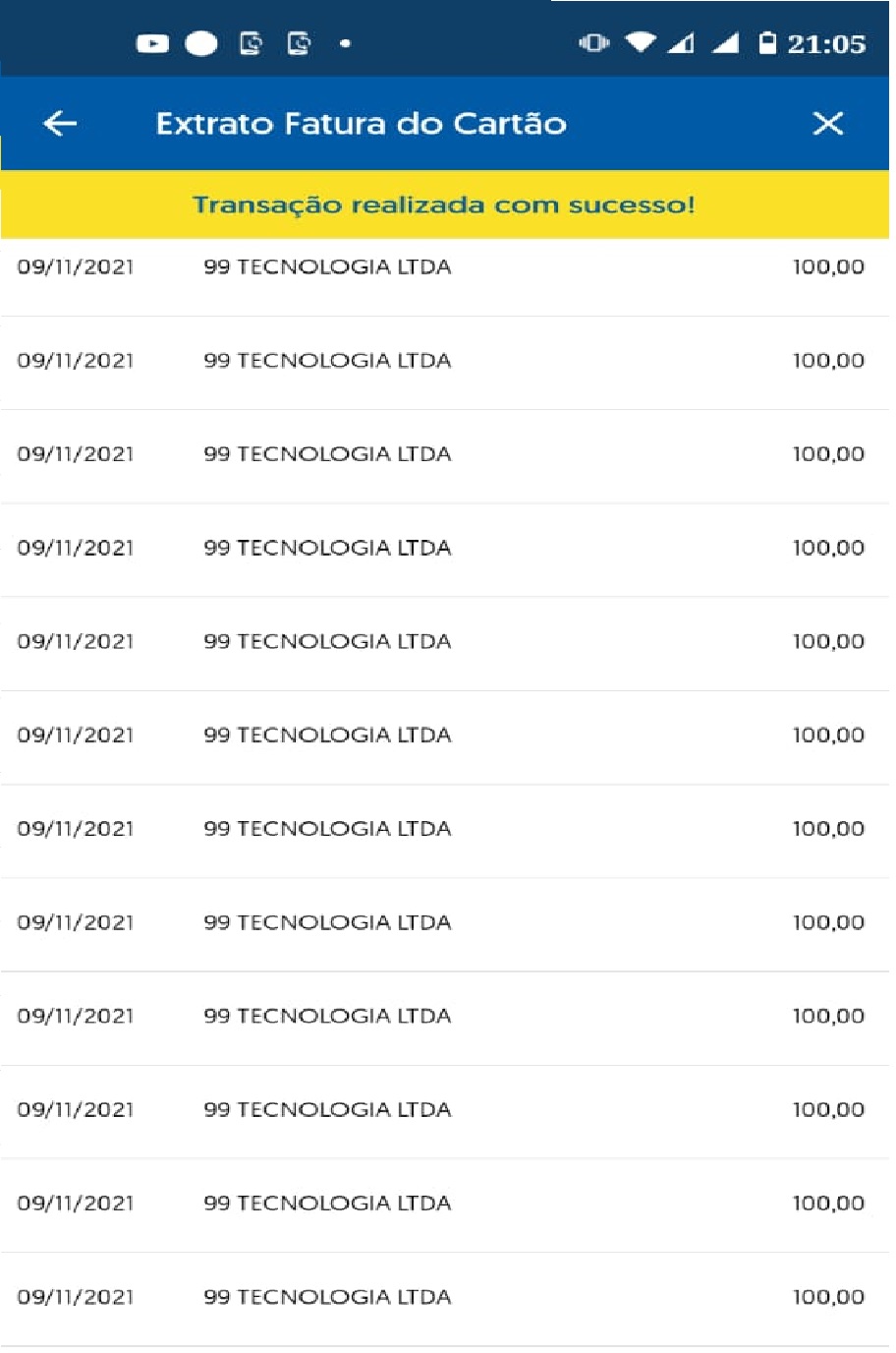 “Eu estava na academia, era de noite. Deixei o celular na minha bolsa e fui fazer meus exercícios. Quando terminei e fui pegar o celular de volta, fiquei aterrorizada quando vi que tinham 48 transações de R$100 feitas no meu cartão por uma tal de ’99 Tecnologia Ltda’. O desespero é enorme, porque claramente eu não fiz uma compra dessa”, falou ao ContilNet.