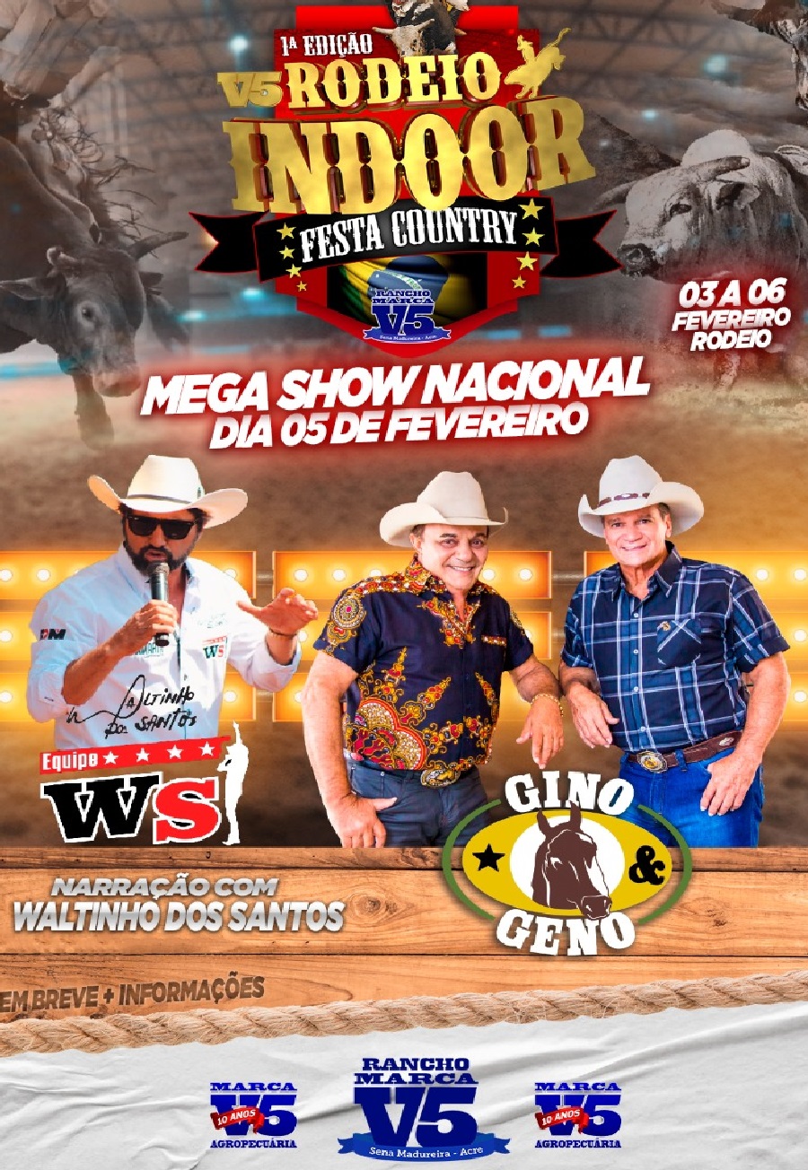 A cidade de Sena Madureira sediará, entre os dias 03 a 06 de fevereiro, a 1ª edição do V5 Rodeio Indoor. A festa country, organizada pelo Rancho Marca V5, contará com show nacional de Gino e Geno e promete movimentar a cidade.