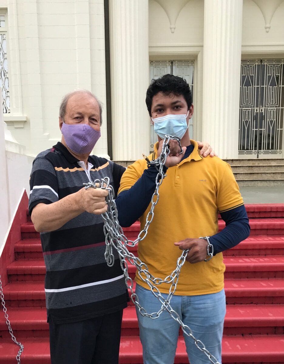 O padre Massimo Lombardi, da Diocese de Rio Branco, visitou nesta segunda-feira (6), o jovem Jorge Orleanes, de 24 anos, integrante do cadastro de reserva da Polícia Civil, que está acorrentado em frente ao Palácio Rio Branco.