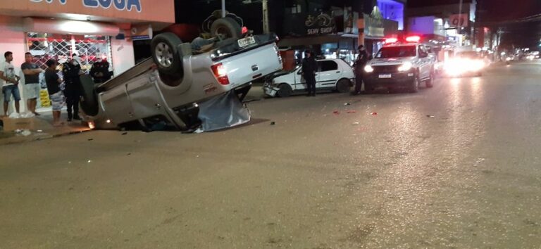 Uma caminhonete modelo Hilux capotou após colidir com uma carro de passeio no cruzamento entre as avenidas Jatuarana e Tancredo Neves, zona sul de Porto Velho, na noite de quinta-feira (6). Com a colisão, a caminhonete ainda atingiu uma motocicleta que estava estacionada.