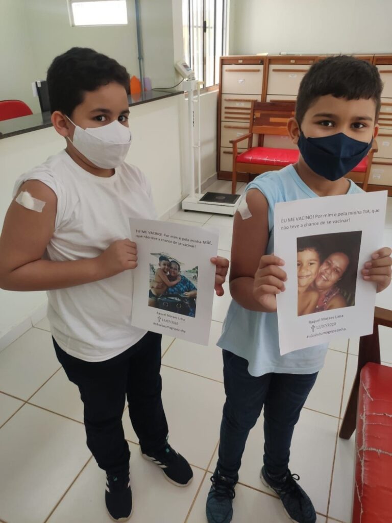 O pequeno João Pedro Lima, de 8 anos, e o primo Murilo Moraes, de 7 anos, se vacinaram no último dia 25 em Rio Branco e levaram a foto de Raquel Moraes, mãe de João Pedro, que morreu em 2020, aos 37 anos, vítima de Covid-19. O momento da vacinação foi registrado pela tia de João Pedro, Isabel Moraes. A foto foi publicada no Facebook, mas acabou sendo repercutida em sites de notícia e em páginas do Instagram com alcance nacional e internacional. Ao saber da repercussão, os meninos ficaram felizes pois estavam incentivando a vacinação.