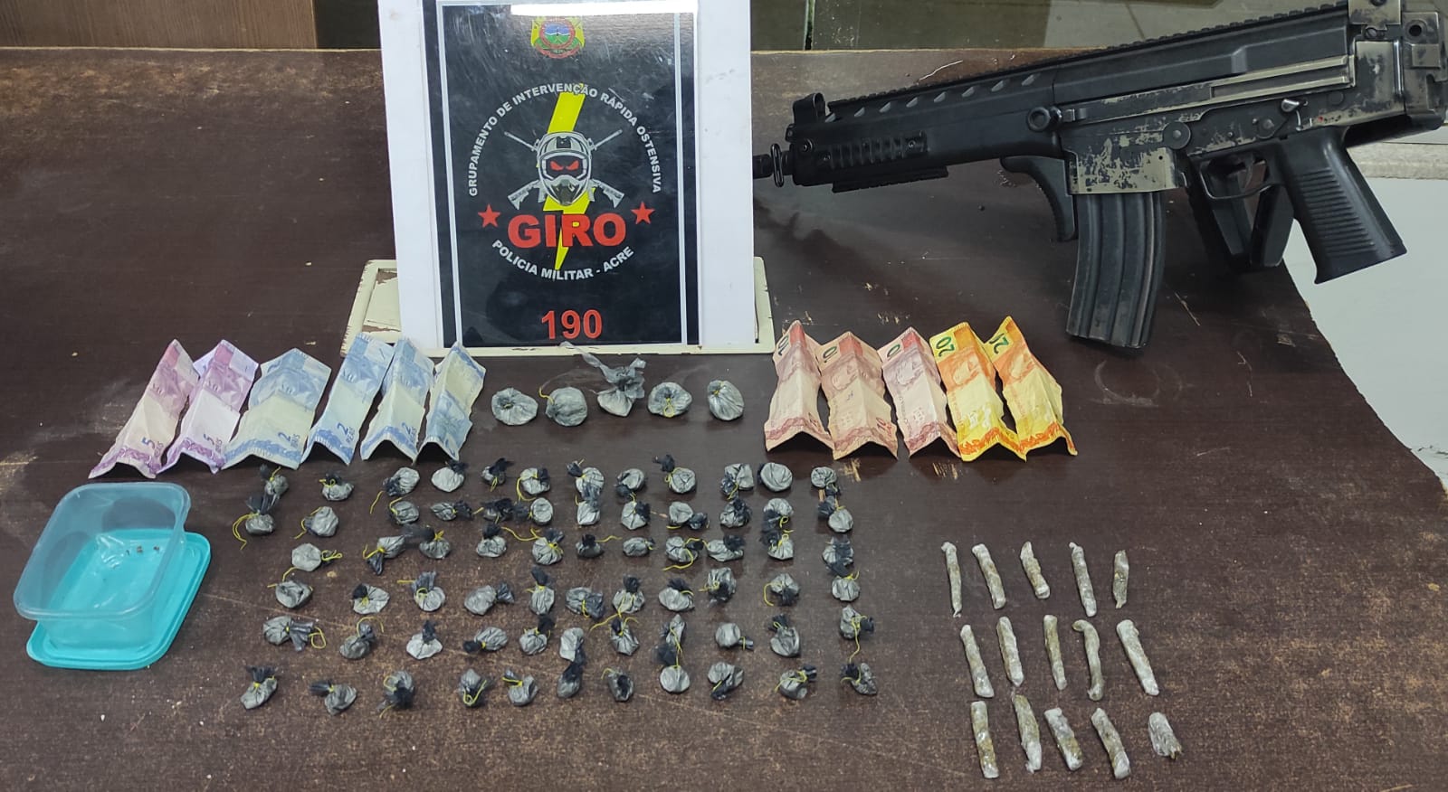 Após buscas no local, foi localizado um recipiente contendo 15 tabletes de uma substância, possivelmente maconha, e três sacos que continham: em dois deles, 68 trouxinhas pequenas de uma substância aparentando ser pasta base de cocaína, e no terceiro, cinco trouxas maiores com a mesma substância.