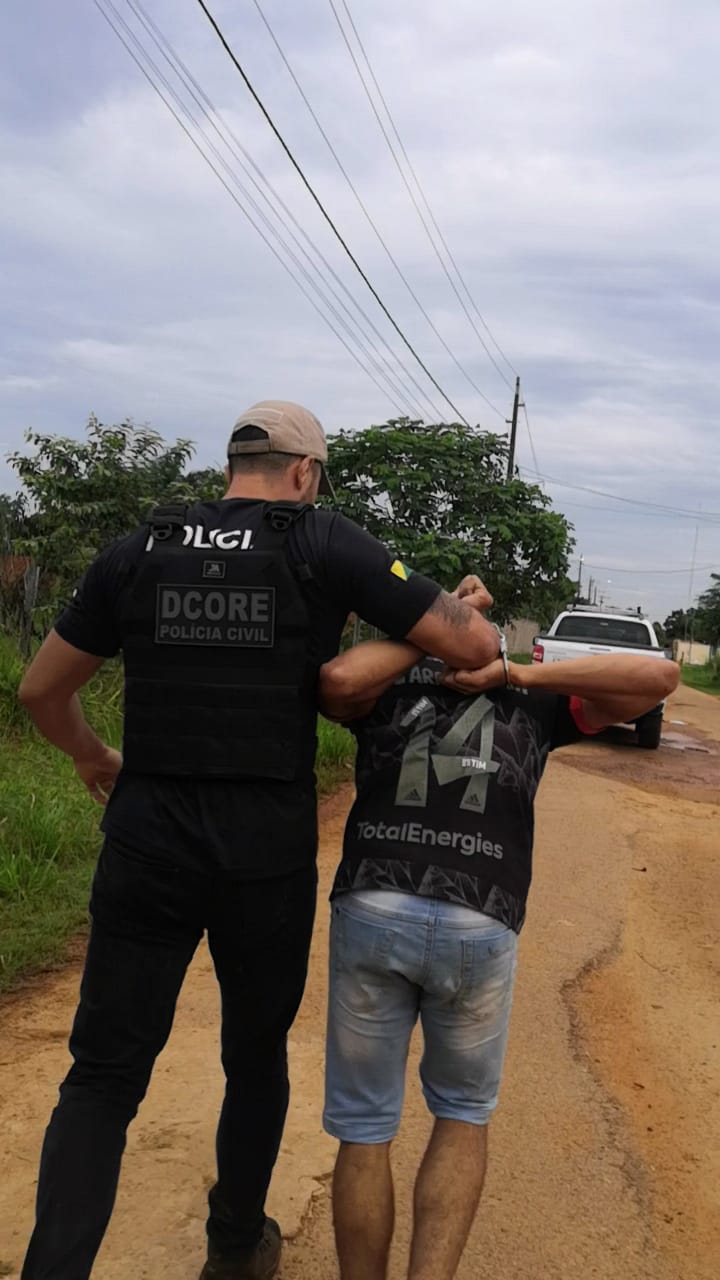 O trabalho investigativo de agentes da DCORE conseguiu localizar o paradeiro de W.A.S. que encontra-se homiziado em uma residência no município de Capixaba. Logo pela manhã, a Policia Civil realizou uma incursão no referido endereço na tentativa de prender o investigado que, ao avistar a viatura policial, empreendeu fuga sendo capturado pelos agentes em um local de difícil acesso no município.