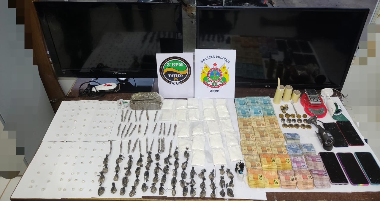 Uma denúncia anônima resultou na apreensão de mais de meio quilo de drogas e R$ 19.743,25 no bairro Placas. A ação policial foi coordenada por militares do Terceiro Batalhão de Polícia Militar (3° BPM) e ocorreu na tarde de segunda-feira, 28 de fevereiro. Foram presos dois homens e duas mulheres. Também foi conduzido à delegacia um adolescente de 15 anos.