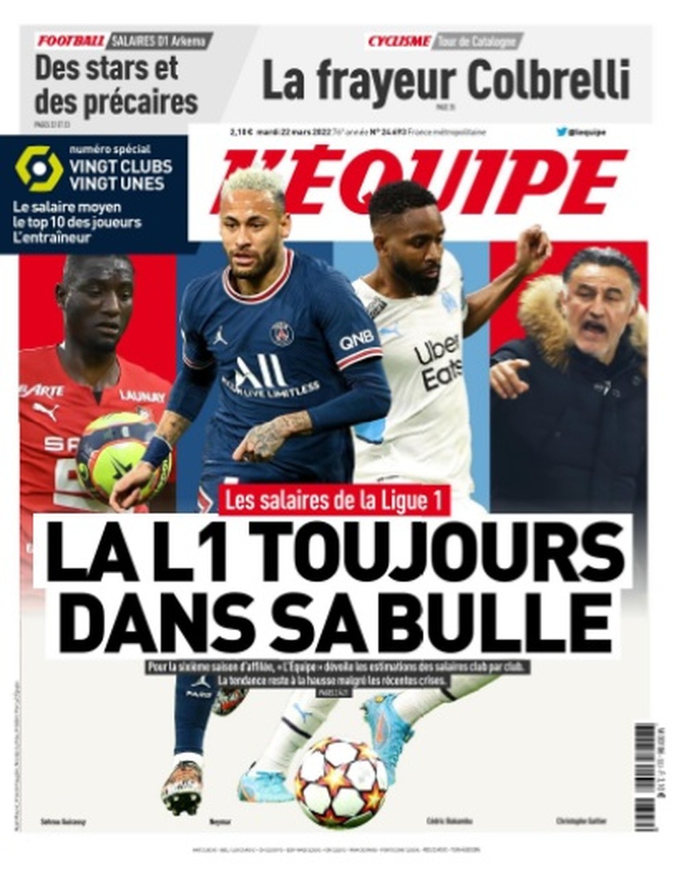 O jornal francês L’Equipe exibe em suas páginas nesta terça-feira um levantamento com os salários dos jogadores do Campeonato Francês. Como é de se esperar, o Paris Saint-Germain domina o top 30, com 21 representantes.