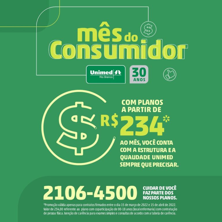 A operadora de saúde, Unimed Rio Branco, celebra o Mês do Consumidor com a promoção para novos planos de saúde contratados entre o dia 15 de março até o dia 15 de abril.