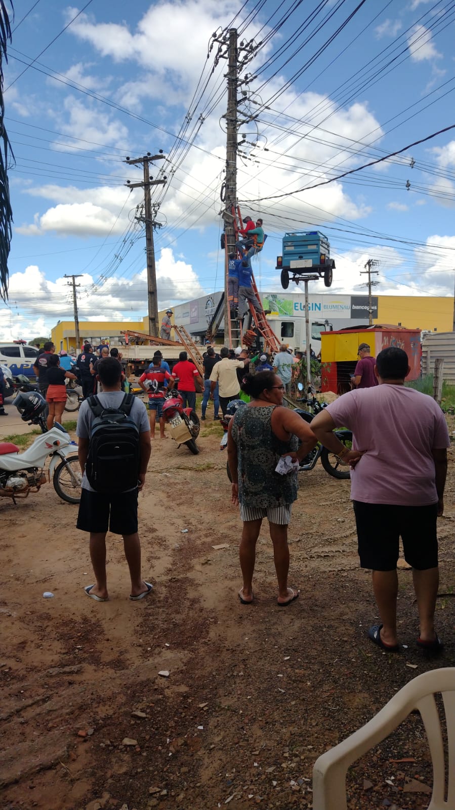 Vídeos que circulam pelas redes sociais registraram o momento do resgate, quando profissionais de uma companhia de energia retiraram o homem dos fios.
