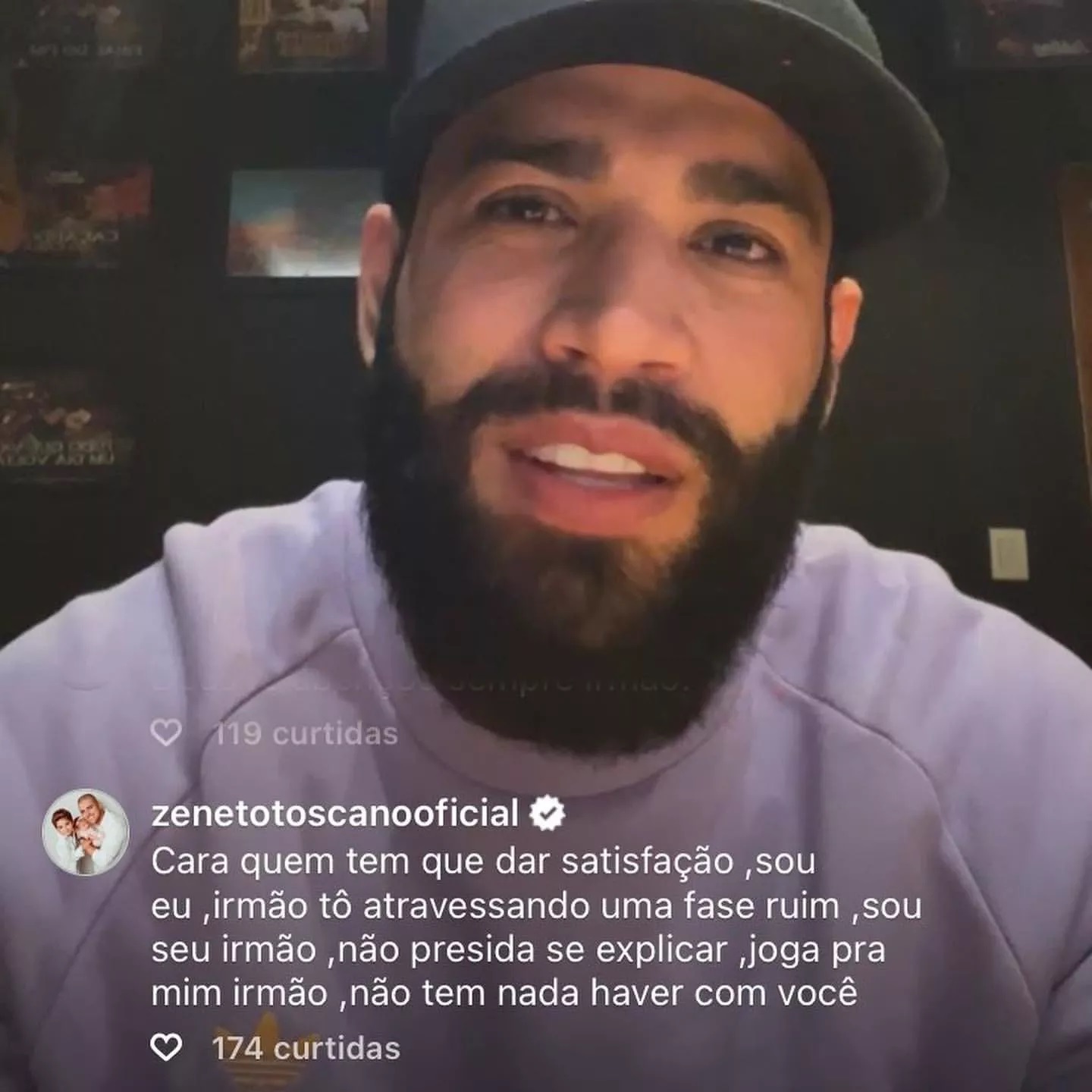 “Cara, quem tem que dar satisfação sou eu. Irmão, estou atravessando uma fase ruim. Sou seu irmão, não precisa se explicar. Joga para mim, irmão. Não tem nada a ver com você”, escreveu o cantor. Logo em seguida, ele pediu de novo. “Não precisa se explicar”.