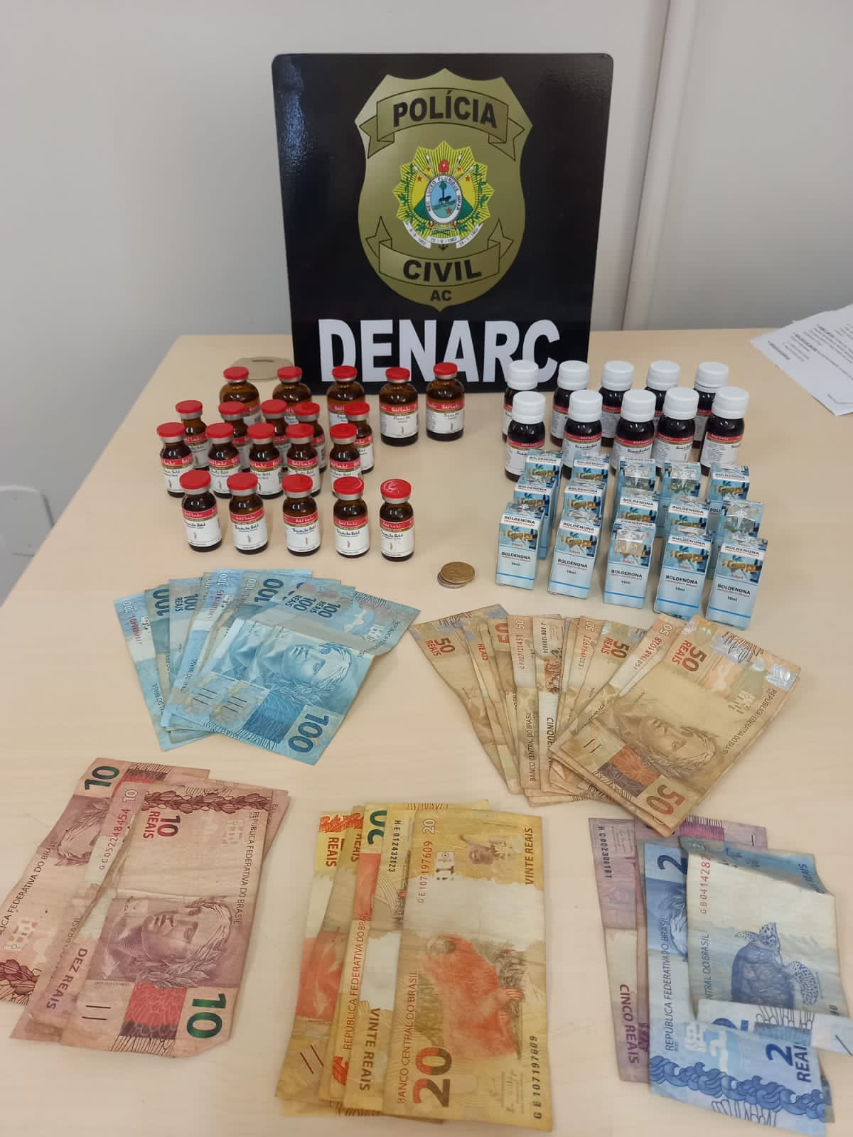 Foram aprendidos vários frascos de supostas substâncias falsificadas de Testosterona, boldenona, stanolozol, oxandrolona.