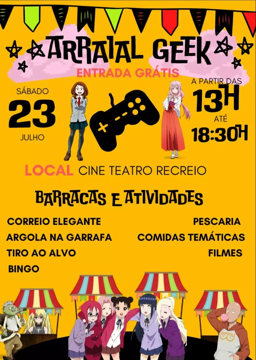 O Arraial Geek acontece neste sábado 23 de julho, das 13h às 18h30, no Cine Teatro Recreio, com barracas e atividades, como Correio Elegante, Argola na Garrafa e mais.