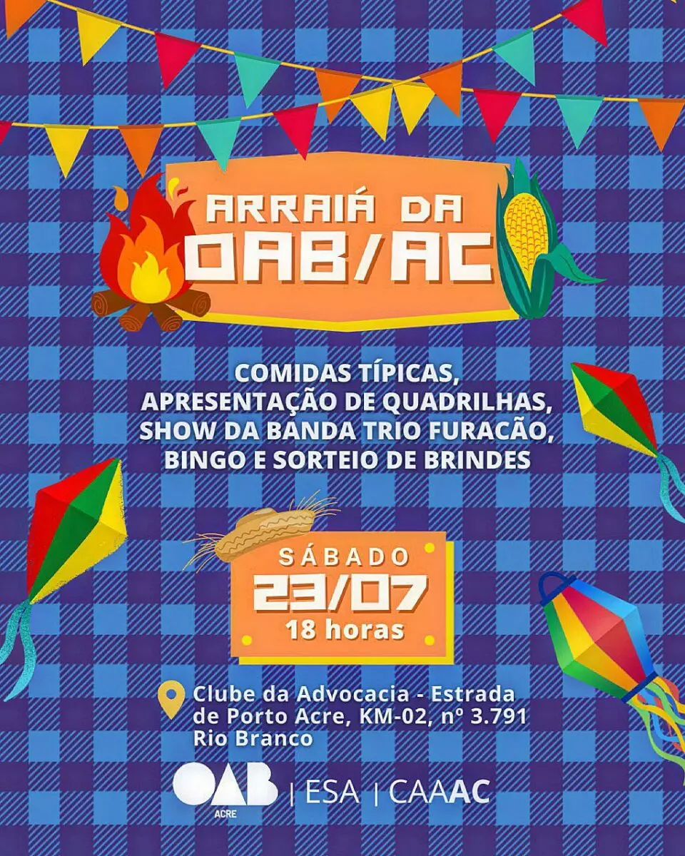 Ainda em clima de arraial, neste sábado (23), acontece o Arraiá da OAB/AC, às 18h, no Clube da Advocacia. O evento conta com comidas típicas, apresentação de quadrilhas e mais.