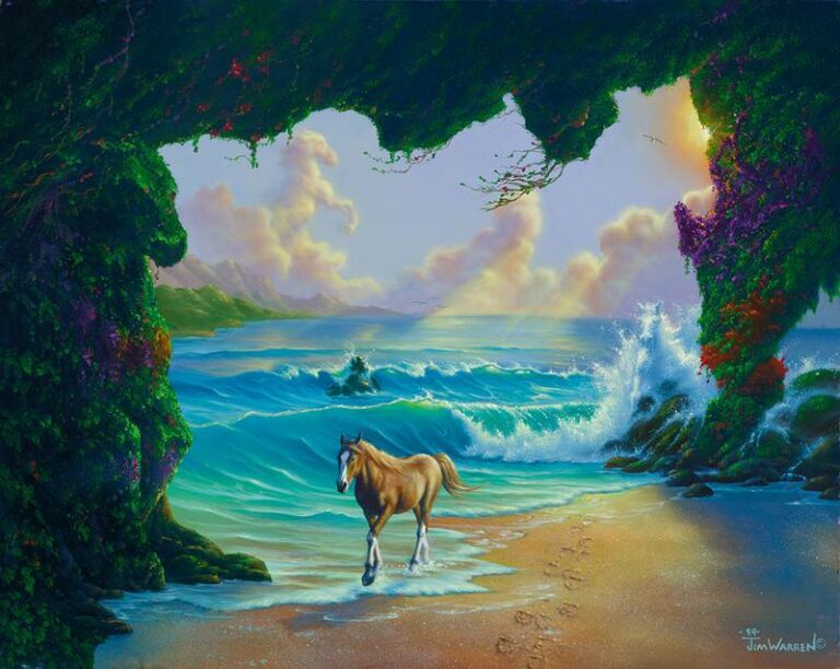 A pintura foi criada por Jim Warren e ele colocou cavalos de todos os formatos. Tem o mais óbvio, ao centro da pintura, os mais fantasiosos como na água e na folhagem, até os mais “sugestivos”, como na sombra ao chão.