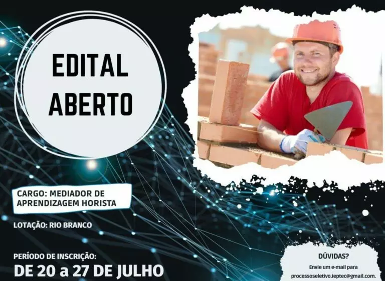 O Instituto de Educação Profissional e Tecnológica (Ieptec) Dom Moacyr lança processo seletivo para a população de Rio Branco e região, com vagas a serem preenchidas no cargo de mediador de aprendizagem horista para acompanhamento nos cursos de Ajudante de Obras, Pedreiro em Alvenaria, Pedreiro em Alvenaria Estrutural e Pedreiro de Revestimento em Argamassa.