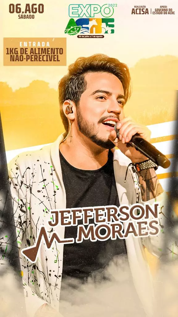 O cantor Jefferson Moraes é mais uma atração confirmada entre as atrações da Expoacre 2022, que será realizada em Rio Branco, a partir de sábado, 30, até o domingo, 7. O show será realizado no sábado, 6. A entrada será um quilo de alimento não perecível.