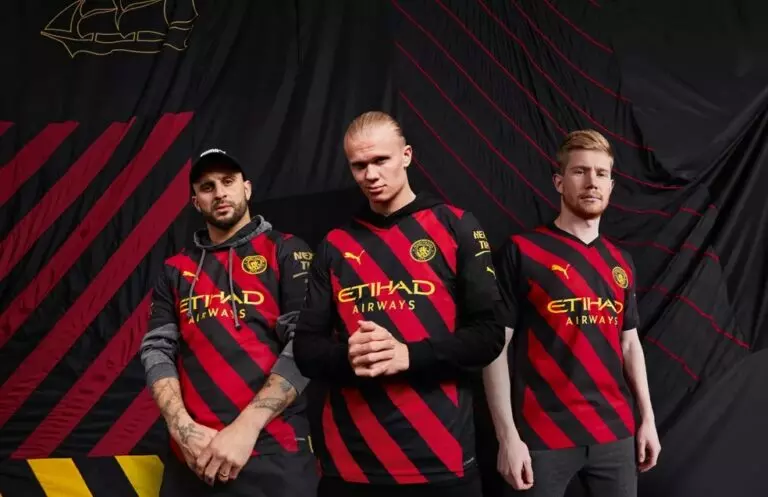 Manchester City divulgou, na manhã desta terça-feira, seu novo uniforme reserva para a temporada 2022/23. Com listras transversais rubro-negras, a camisa relembra uma das épocas de mais sucesso do clube, quando venceram a Copa da Inglaterra, em 1969, e a Copa da Liga, no ano seguinte, ficando na história dos Citizens.