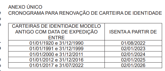 A renovação das carteiras de identidade será considerada como primeira emissão, ou seja, não será necessário o pagamento e serão válidas até 1º de março de 2032.