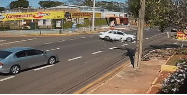 Nas imagens é possível ver o carro aguardando na avenida Constantino para cruzar a avenida Marechal Deodoro. Contudo, no momento em que ele vai realizar a manobra ocorre a colisão com uma motocicleta que trafegava na Avenida Marechal Deodoro.