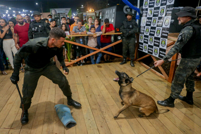 Um grande público se reuniu no estande do Instituto de Administração Penitenciária do Acre (Iapen), na noite da quinta-feira, 5, para ver a apresentação dos cães farejadores.