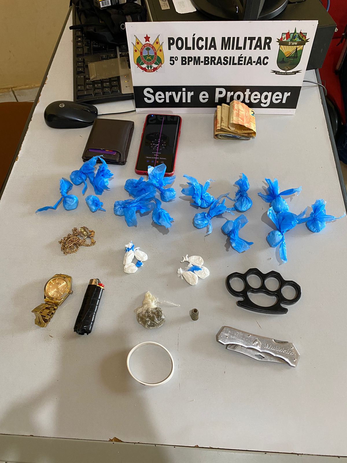 Na abordagem, em uma das bolsas foram encontradas seis trouxinhas de um pó branco, provavelmente cocaína, um invólucro em papel filme aparentando ser maconha, uma munição. 40 intacta e um celular marca Samsung.