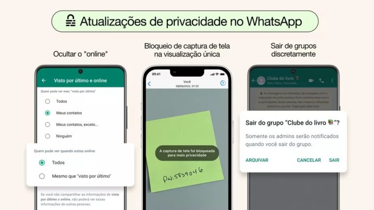 O WhatsApp, plataforma de envio de mensagens da Meta, terá três novas atualizações voltadas para a privacidade dos usuários. Será possível escolher quem poderá visualizar o seu status on-line, bloquear capturas de tela para mensagens de visualização única e ainda uma forma de evitar “climão” para sair de grupos indesejados sem notificar os participantes.